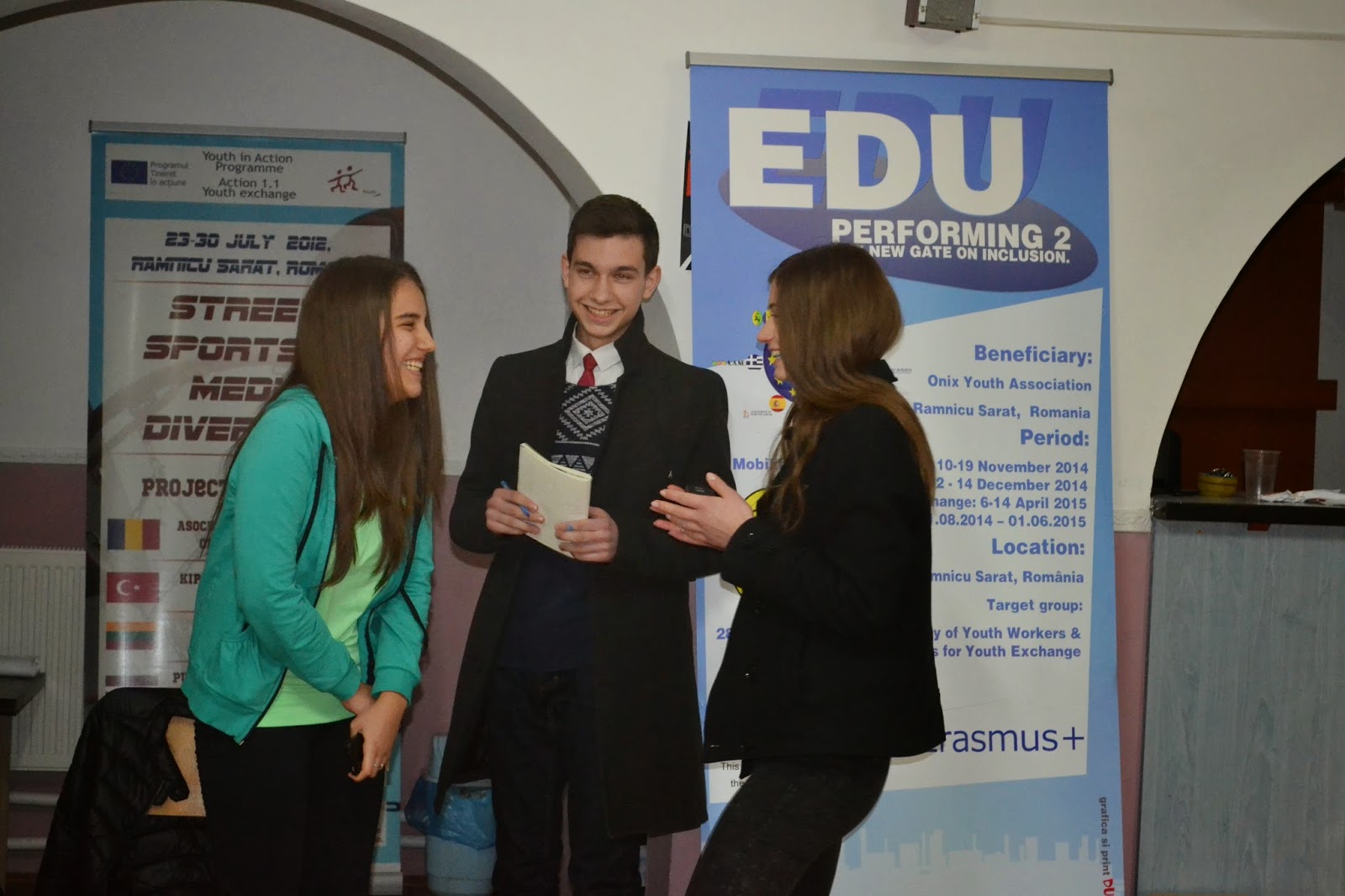 Proiectul a fost o continuare a Edu Performing I, proiect in care am avut sansa de a ma initia in educatia non-formala ca si participant, in care am invatat cum sa implementez metode de educatie non-formala clasice, precum dezbatere, cafenea public, teatru forum, open space, activitati de team-buiding etc. Aceasta experienta m-a ajutat deoarece aveam perspectiva participantului, ceea ce asteapata de la formator si ce este pregatit sa ofere. Pornind de la experienta de participant si mai ales din ultimele doua zile din Edu Performing I, cand am creat impreuna cu ceilalti participanti si cu indrumarea formatorilor metodele de educatie non-formale iar mai apoi am fost pusi in situatia de a implementa acele metode, urmand ca in final acestea sa stea la baza proiectului Edu Performing II.